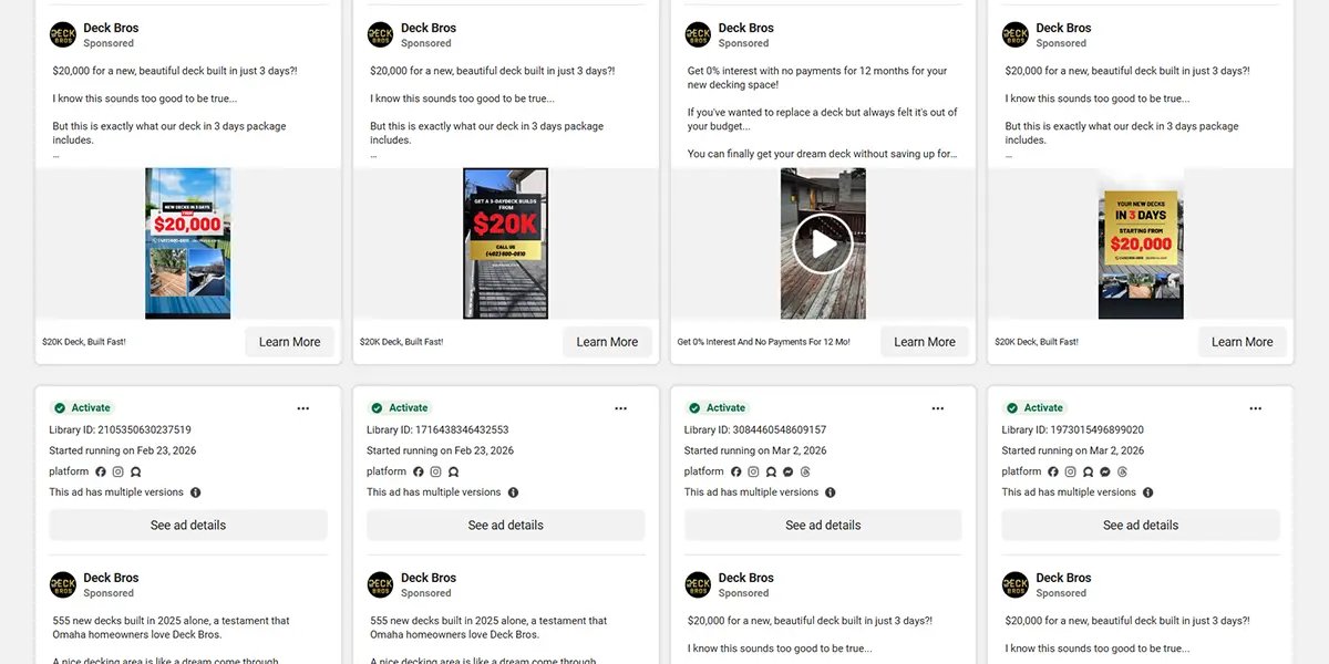 Facebook Ads Library showing a decking company running Facebook Ads