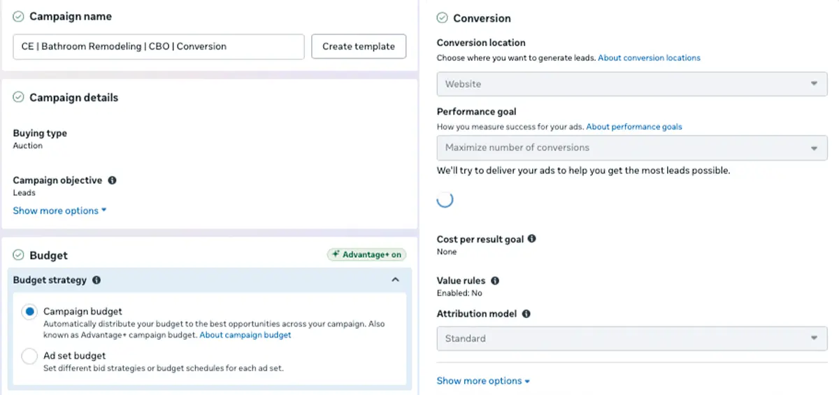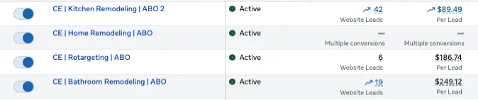 Different setup settings for a remodeling client on Facebook Ads