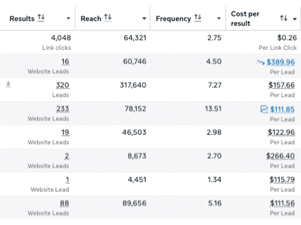 Facebook Ads interface. Notice the cost per lead is almost as high as on Google ads. That's because these ads prequalify the prospects.