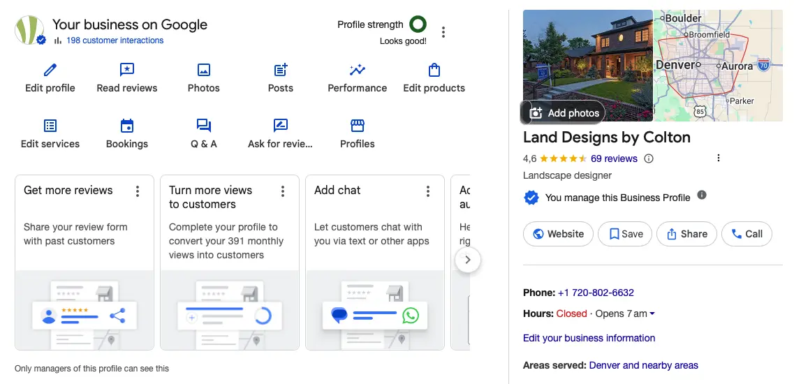 Land Designs By Colton's Google Business Profile. See 100% profile strength in the top-middle of the image. That means this profile is fully optimized and ranks higher because of that.