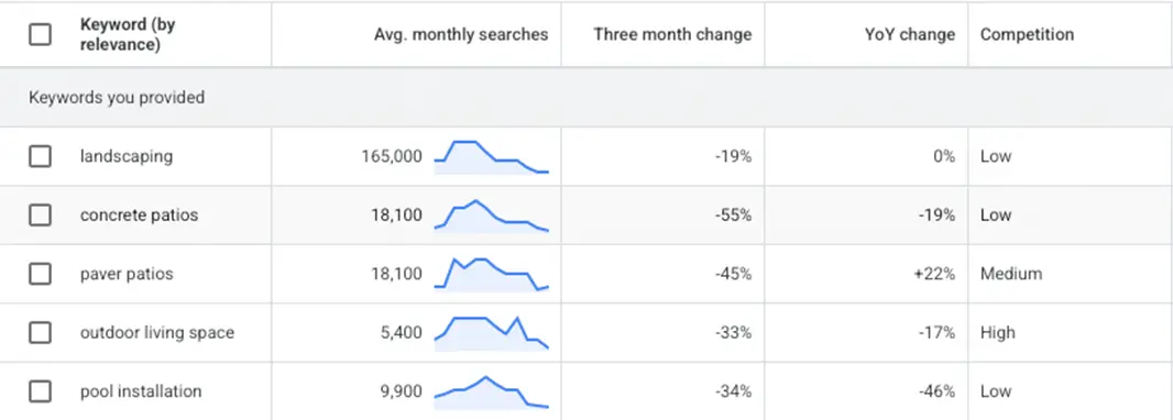 From the Google Keyword Planner in Google Ads platform, this is the search volume for various keywords closely related to landscaping services.