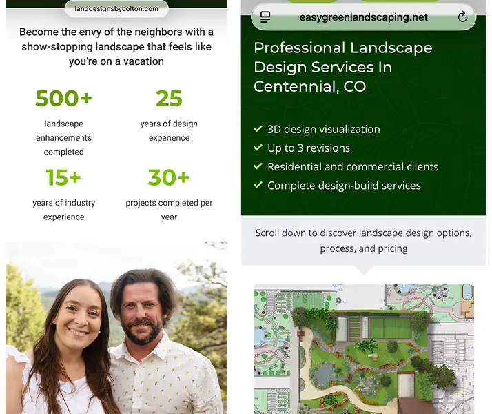 Two landscaping websites as seen on mobile. This is just part of the website.