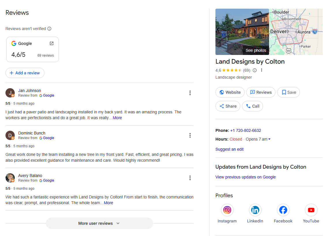 A landscaper business profile on Google. This is a Google Business Profile.