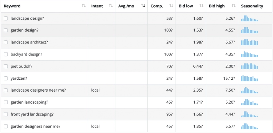 The keyword volume and competition for different landscaping search terms.
